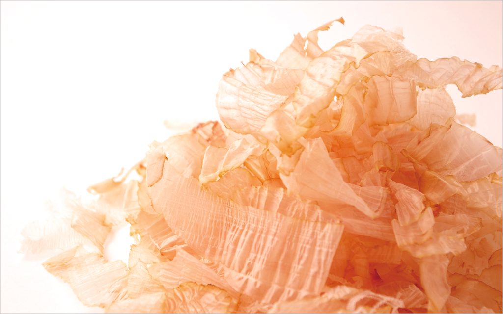 前者の例が、かつお節。かつお節は生のカツオを湯で煮た後、煙で燻すことによって作られますが、煮た直後のカツオはいわゆる煮魚の状態であり、その色は灰色というか肌色というか、ちょっとくすんだ色。この色が、煙で燻されることによって鮮やかなピンク色に変わります。カツオの筋肉中のミオグロビンという物質が、煙の中の一酸化炭素とひっつくことによって発色するのです。