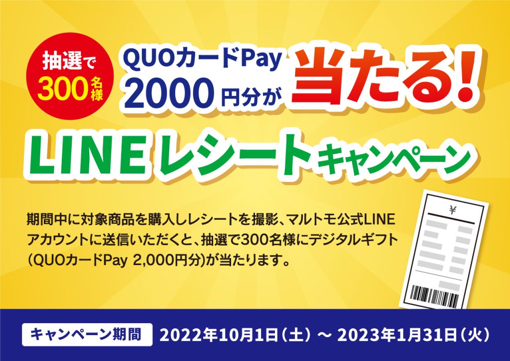 期間中に対象商品を購入しレシートを撮影、マルトモ公式LINEアカウントに送信いただくと、抽選で300名様にデジタルギフト(QUOカードPay)2,000円分が当たります。