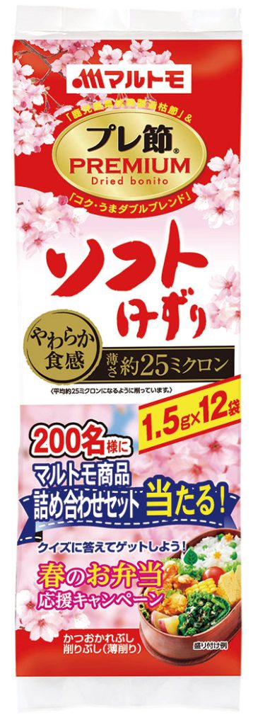かつお節・だしと、海洋資源を通じて健康と食文化の発展に貢献するマルトモ株式会社(社長:今井均 本社:愛媛県伊予市)は、芽吹きの春の売り場を華やかに演出し、食卓に旬のおいしさを届けるべく、桜をパッケージにデザインした「プレ節Ⓡ25ミクロンソフトけずり1.5g×12袋」を全国で数量限定発売します。また、「春のお弁当応援キャンペーン」も同時開催し、生活者の皆様の春のお弁当作りを応援します。