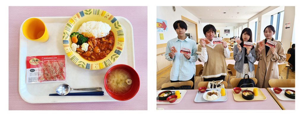 ▲「スカイラウンジ暁」で提供される食事一例と、企画立案した学生たち