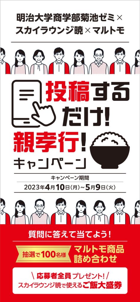 本キャンペーンアイディアは、Z世代の新たな発想でかつお節・だしとマルトモの認知拡大を目的に2022年12月16日に実施した、「マルトモ杯マーケティング施策コンペ」で最優秀賞を獲得した明治大学商学部菊池一夫ゼミナール(研究テーマ:マーケティング)の学生によるもの。明治大学駿河台キャンパス内の学生食堂「スカイラウンジ暁」において、明大生がかつお節に親しめるような企画を提案し、今回のキャンペーンが実現いたしました。