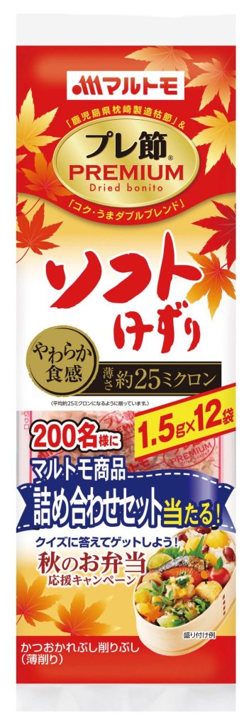 かつお節・だしと、海洋資源を通じて健康と食文化の発展に貢献するマルトモ株式会社(社長:今井均 本社:愛媛県伊予市)は、実りの秋の売り場を華やかに演出し、食卓に旬のおいしさを届けるべく、紅葉をパッケージにデザインした「プレ節Ⓡ25ミクロンソフトけずり1.5g×12袋」を全国で数量限定発売します。また、「秋のお弁当応援キャンペーン」も同時開催し、生活者の皆様の秋のお弁当作りを応援します。