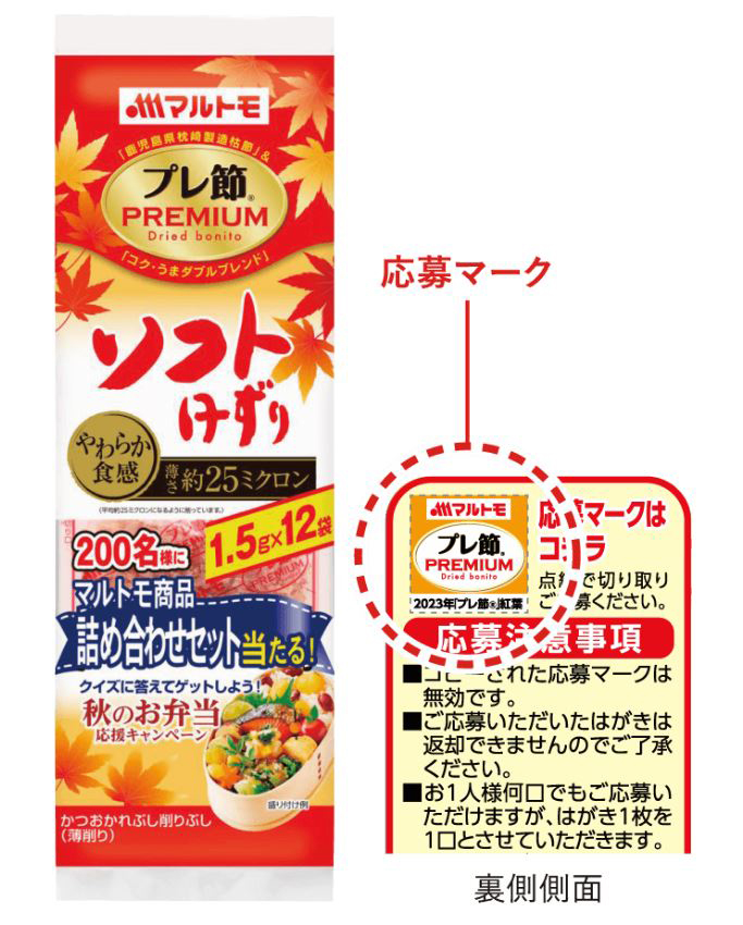 本キャンペーンは、数量限定発売の「プレ節Ⓡ」紅葉デザイン商品を対象とし、必要事項を記入の上、パッケージ側面に印刷されている応募マークをハガキに貼り付け応募すると、忙しい朝のお弁当作りに役立つマルトモ商品詰め合わせセットが抽選で200名様に当たります。紅葉のように美しく彩りを添える「プレ節Ⓡ」で秋のお弁当をよりおいしく、華やかに演出しませんか?