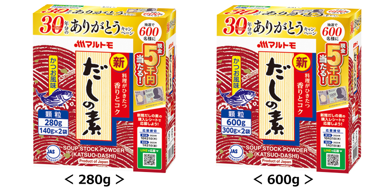 かつお節・だしと、海洋資源を通じて健康と食文化の発展に貢献するマルトモ株式会社(社長:今井均 本社:愛媛県伊予市)は、これまでのご愛顧に感謝し、発売中の「新鰹だしの素280g」、「新鰹だしの素350g」、「新鰹だしの素450g」、「新鰹だしの素600g」を対象商品として「30年分のありがとうキャンペーン」を実施いたします。
