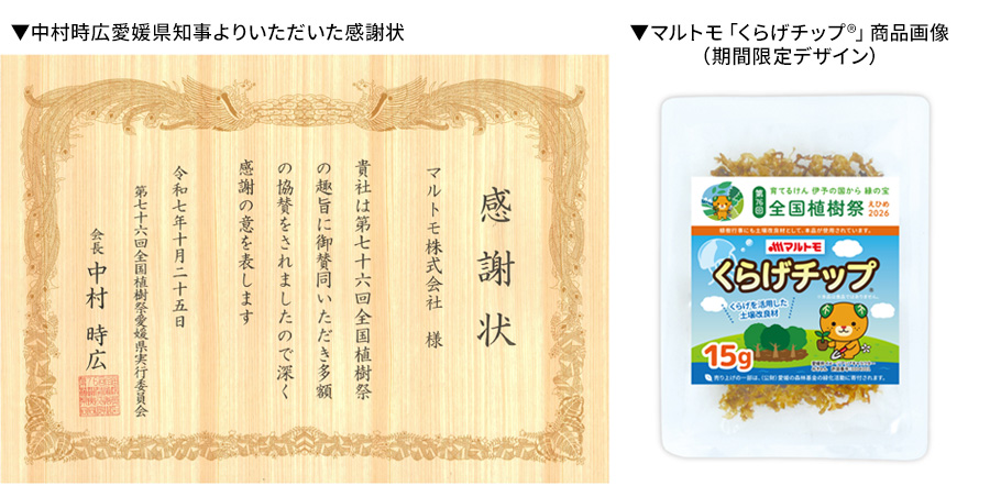 かつお節・だしと、海洋資源を通じて健康と食文化の発展に貢献するマルトモ株式会社(社長:明関眸 本社:愛媛県伊予市)は、「第76回全国植樹祭えひめ2026」に協賛しています。10月25日(土)、「エミフルMASAKI」にて感謝状贈呈式が行われ、マルトモ株式会社 代表取締役社長 明関眸が中村時広愛媛県知事から感謝状を受け取りました。