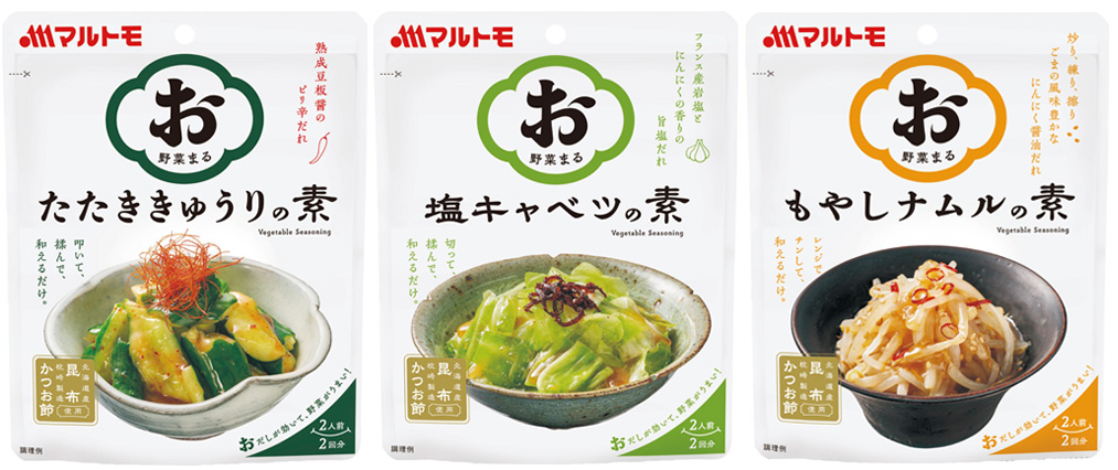 1.商品名:「お野菜まるⓇ」たたききゅうりの素、塩キャベツの素、もやしナムルの素
