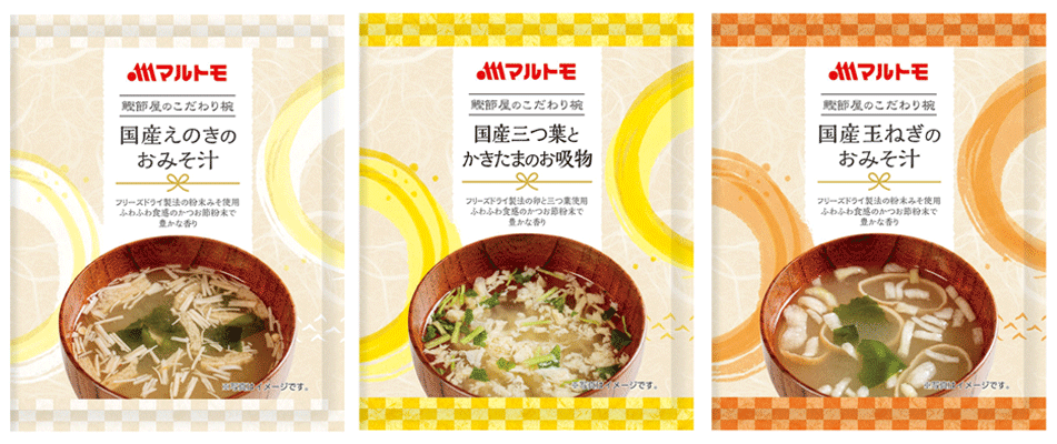 このたび、通販限定の新商品として発売するのは「国産玉ねぎのおみそ汁」「国産えのきのおみそ汁」「国産三つ葉とかきたまのお吸物」の3種です。国産の具材を厳選し、フリーズドライ製法の粉末みそと卵を使用しました。また、だし素材として国内製造かつお荒節の粉末を使用し、豊かな香りとだし感にこだわりました。お湯にサッと溶ける粉末タイプなので、忙しい朝でも簡単・手軽にいただけます。ブロックタイプとは違い、コンパクトに持ち運べるためお弁当と一緒にランチにもおすすめ!パッケージは水引が入ったかわいらしいデザインで、ちょっとしたギフトにもご活用いただけます。