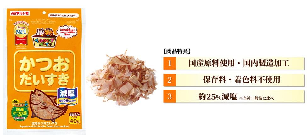 「減塩かつおだいすき40g」は、ペット用おやつとして販売しているマルトモ「だいすきシリーズ」の一つで、大切な家族の一員であるねこちゃん・わんちゃんに安心・安全な食事を提供したいという想いで作られた商品です。近年、ねこちゃん・わんちゃん達も平均寿命が延び健康寿命が課題といわれている中、マルトモはねこちゃん・わんちゃん達の食生活改善のためにいち早く減塩商品提案に取り組んでおり、この商品は、当社一般品に比べ塩分を約25%カットした、健康に配慮した商品となっております。