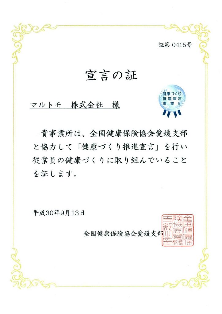 全国健康保険協会愛媛支部と協力して「健康づくり推進宣言」を行い、従業員の健康づくりに取り組んで参ります。