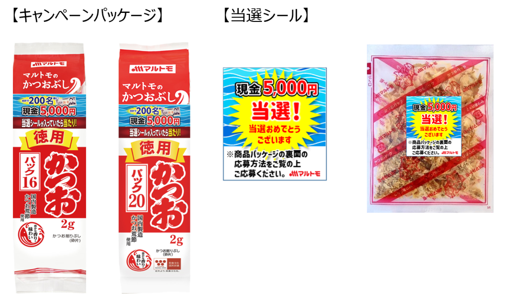 当キャンペーンは、「徳用かつおパック16PS」、「徳用かつおパック20PS」のキャンペーンパッケージ商品をご購入いただき、当選シールが入っていたら合計200名様に現金5,000円が当たるというものです。