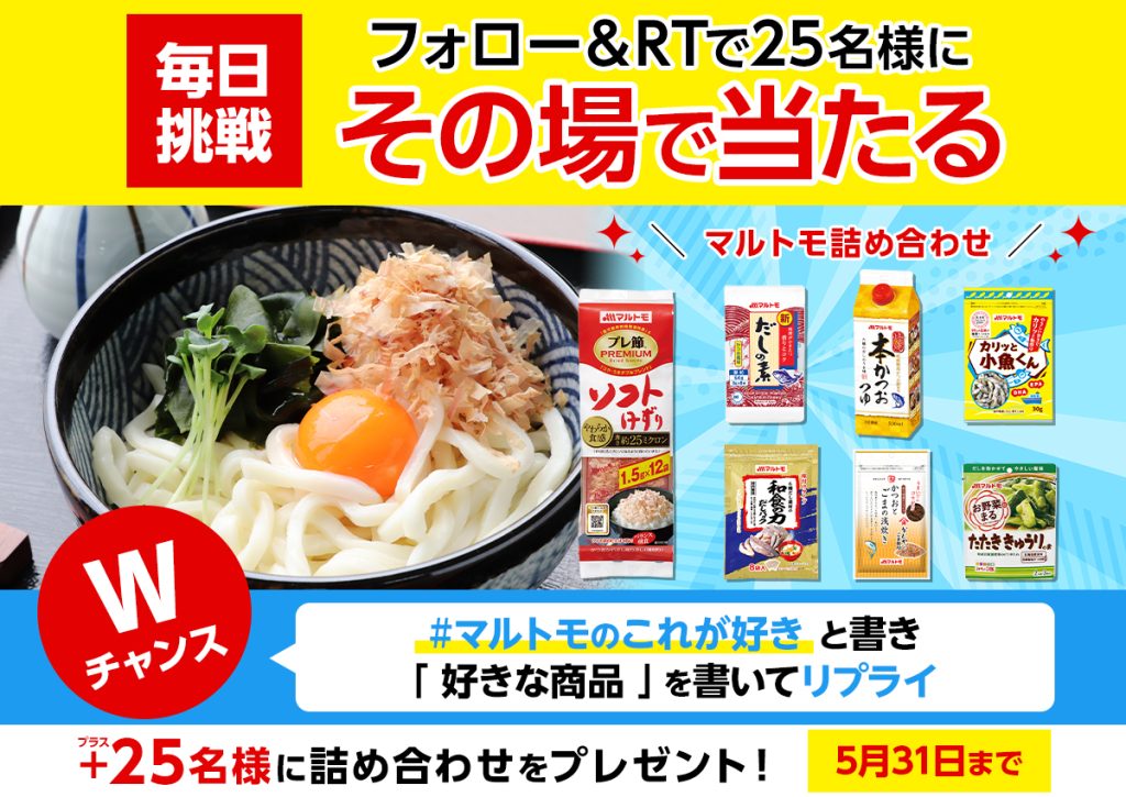 〈マルトモ公式Twitter:マルトモの好きな商品教えて!フォロー&RTでマルトモ商品詰め合わせが当たる!キャンペーン〉