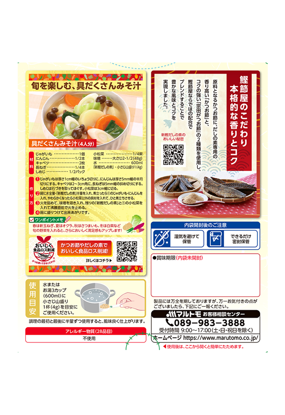おすすめの食べ方:みそ汁、お吸い物のだし、煮物のだしに最適です。水またはお湯3カップ(600㎖)に小さじ山盛り1杯(4g)を目安にご使用ください。