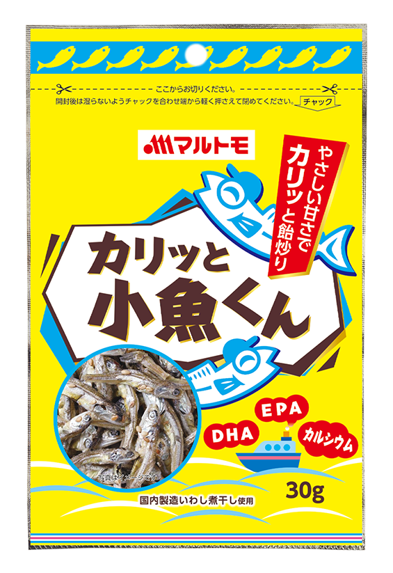 健康食材として昔から食べ継がれてきた煮干しを、家族誰でもおいしく食べやすいように、カリッと飴炒りに仕上げた健康的なおやつ。