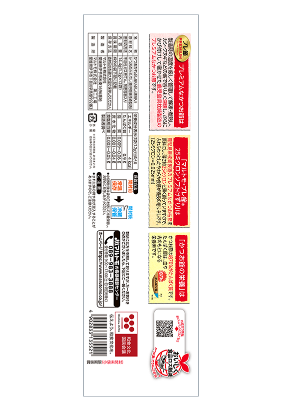 製造時の温度を厳しく管理して解凍・煮熟した2種類の節を使った「コク・うまダブルブレンド」を25ミクロン※の薄さに削り上げた一品です。