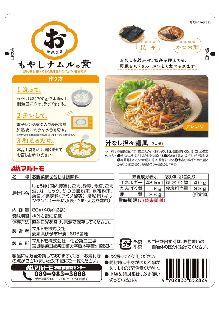 ③ 「もやしナムルの素」を1袋かけ、軽くまぜてお召しあがりください。