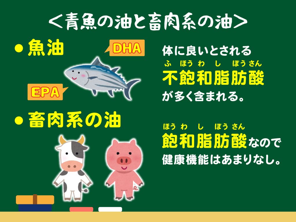 だしに適した魚は全て青魚で、その魚油にはEPAやDHAなど、体に良いとされる不飽和脂肪酸が多く含まれています。牛や豚などの畜肉系の油は飽和脂肪酸で、健康機能はあまりありません。