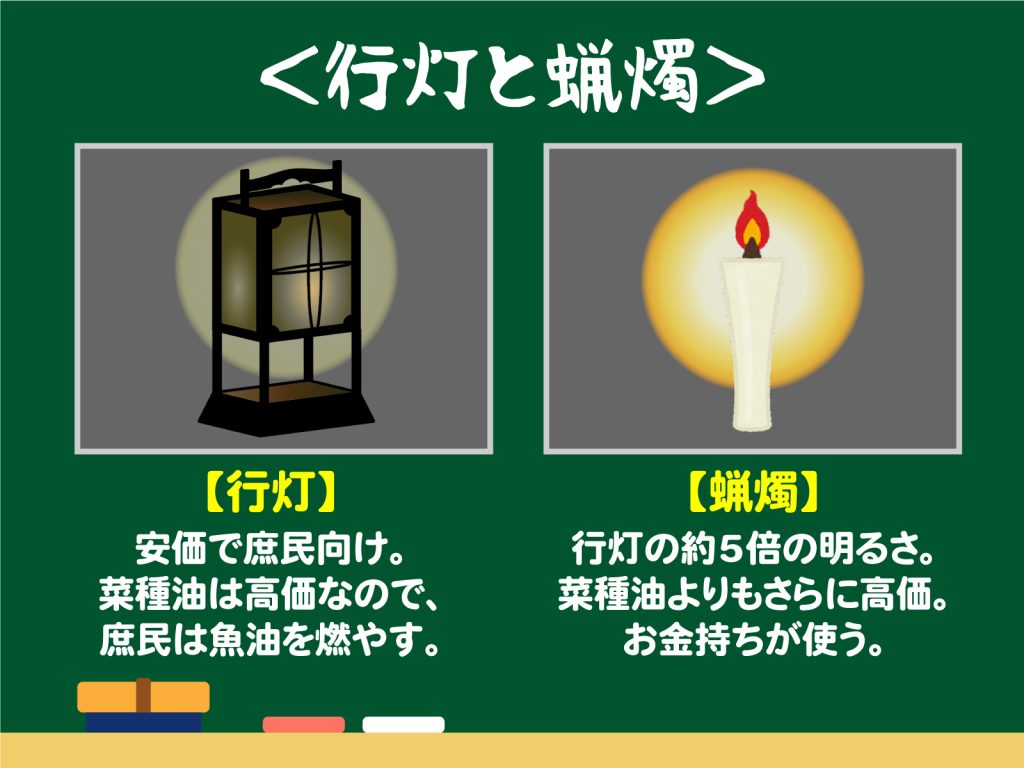 菜種油なら臭みは少ないのですが、価格が魚油の2倍もするため使っているのは遊郭ぐらい。蝋燭はさらに高価で、悪代官か殿様の邸宅にしかなかったはずです。