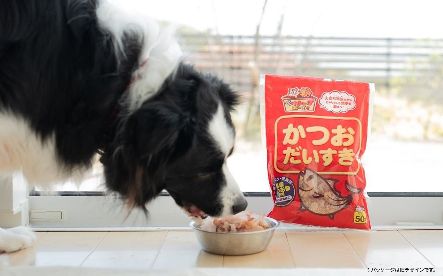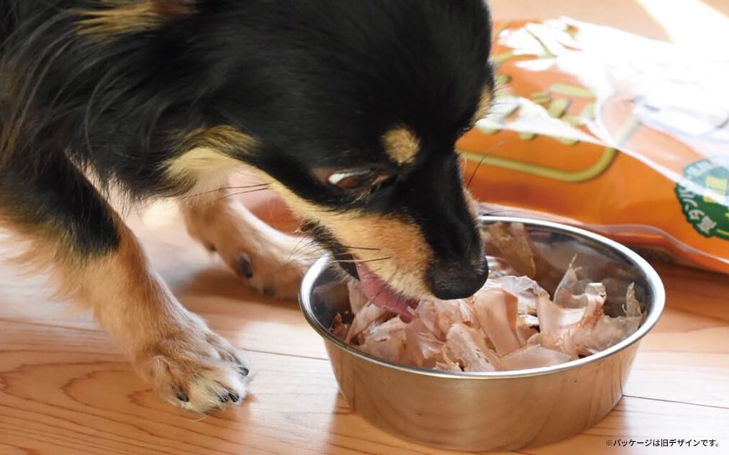 もちろん、犬の必須アミノ酸であるタウリンを多く含むかつお節のペットフード、「かつおだいすき」をトッピングすることを忘れずに。