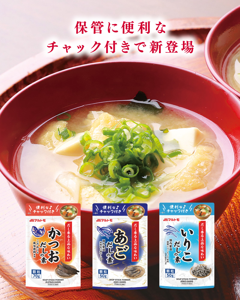 使いやすい1袋の包装でお好みに合わせて量の調節ができます。お求めやすい価格と量のだしの素。初めての方や少人数家族向けにぴったりです。