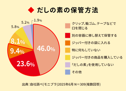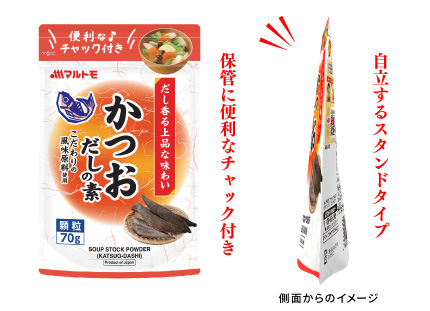 マルトモの「だしの素」はチャック付きの自立するスタンドタイプなのでそんなひと手間を減らせます。