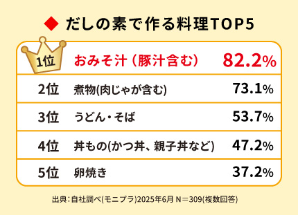 おみそ汁に次いで煮物やうどん、そばなど「だしの素」と言えばという料理がランクイン。そんな定番料理からアレンジ料理までマルトモHPでは様々なメニュー提案をしています。