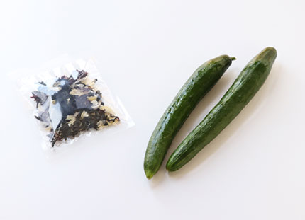 乾燥具材を水で戻し、切ったきゅうりとあえるだけ!簡単、手間なく、火を使うこともなく、食卓を彩るもう1品が完成します。