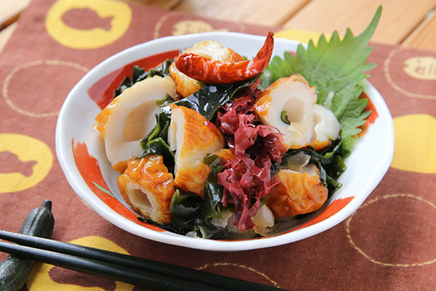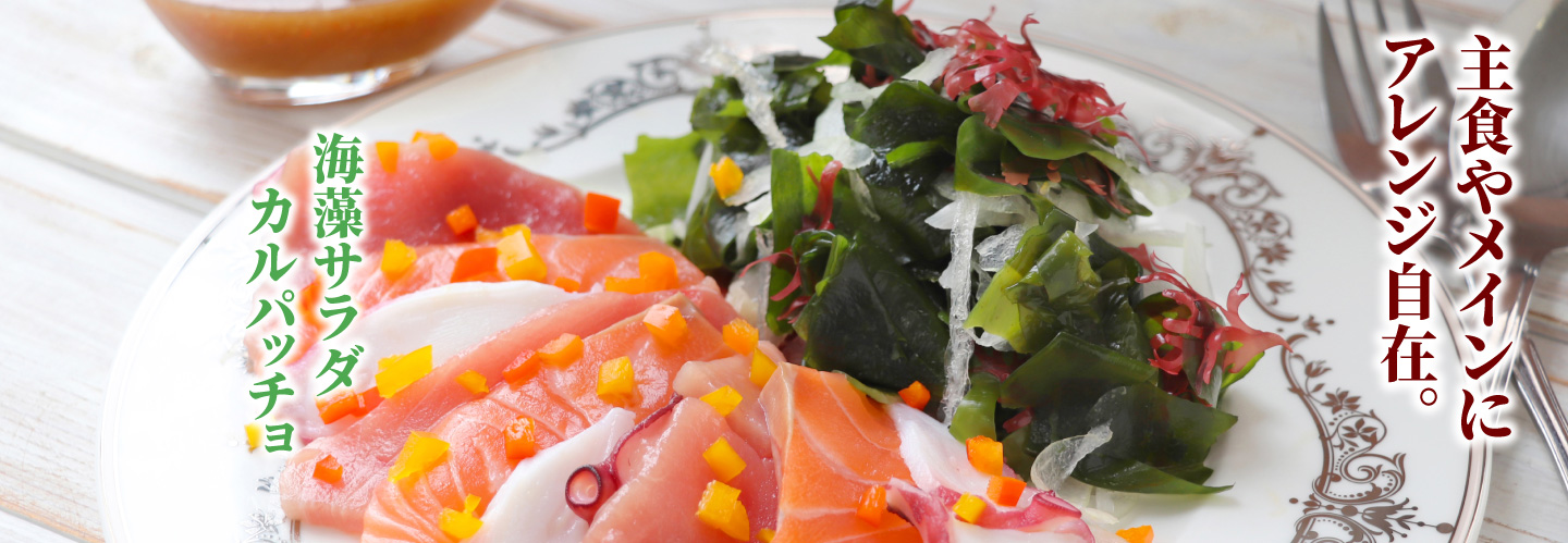 4種の彩り具材(わかめ、白きくらげ、赤かえでのり、糸寒天)で彩り豊かな海藻サラダです。