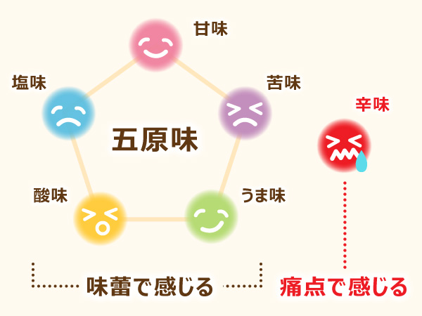 他に、辛味もありますが味蕾ではなく、痛覚を伴うもので、五原味には含まれません。