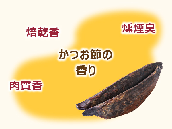 主成分はイノシン酸といううま味成分ですが、これに何ともいえない深み、余韻のような「コク」、そして、何ともいえない幸せを感じる「香り」が加わってかつおだし特有のおいしさを作っています。