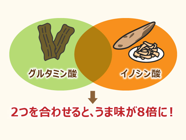 かつお節のイノシン酸と昆布のグルタミン酸を合わせると、おいしさは足し算ではなく、なんと7~8倍と飛躍的に強くなり、これを「うま味の相乗効果」といいます。