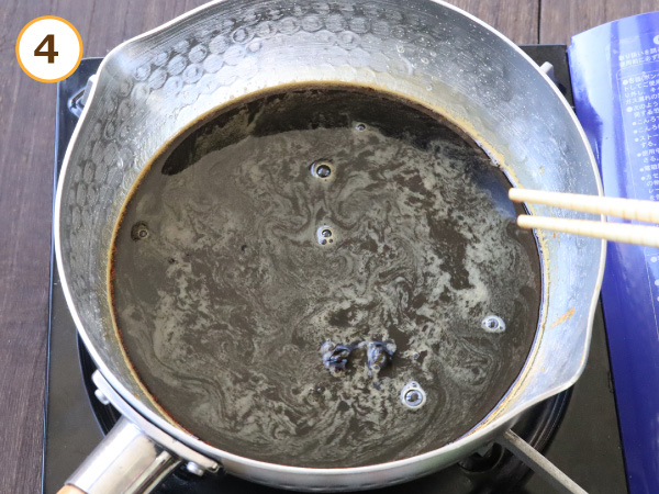 ③砂糖が溶けたらしょうゆを入れ、弱火で沸騰させないように加熱する(沸騰させるとしょうゆの風味が飛んでしまうため)。